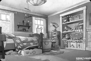Bonnie's room is where Bonnie keeps her toys, including the ones she receives as gift from Andy. It is first seen when Bonnie adds Woody into a tea party with Mr. Pricklepants, Buttercup and Trixie. In the credits, Buzz and Jessie perform a paso doble to the Spanish version of the song You've Got a Friend in Me in this room. This room is ruled by Jessie.