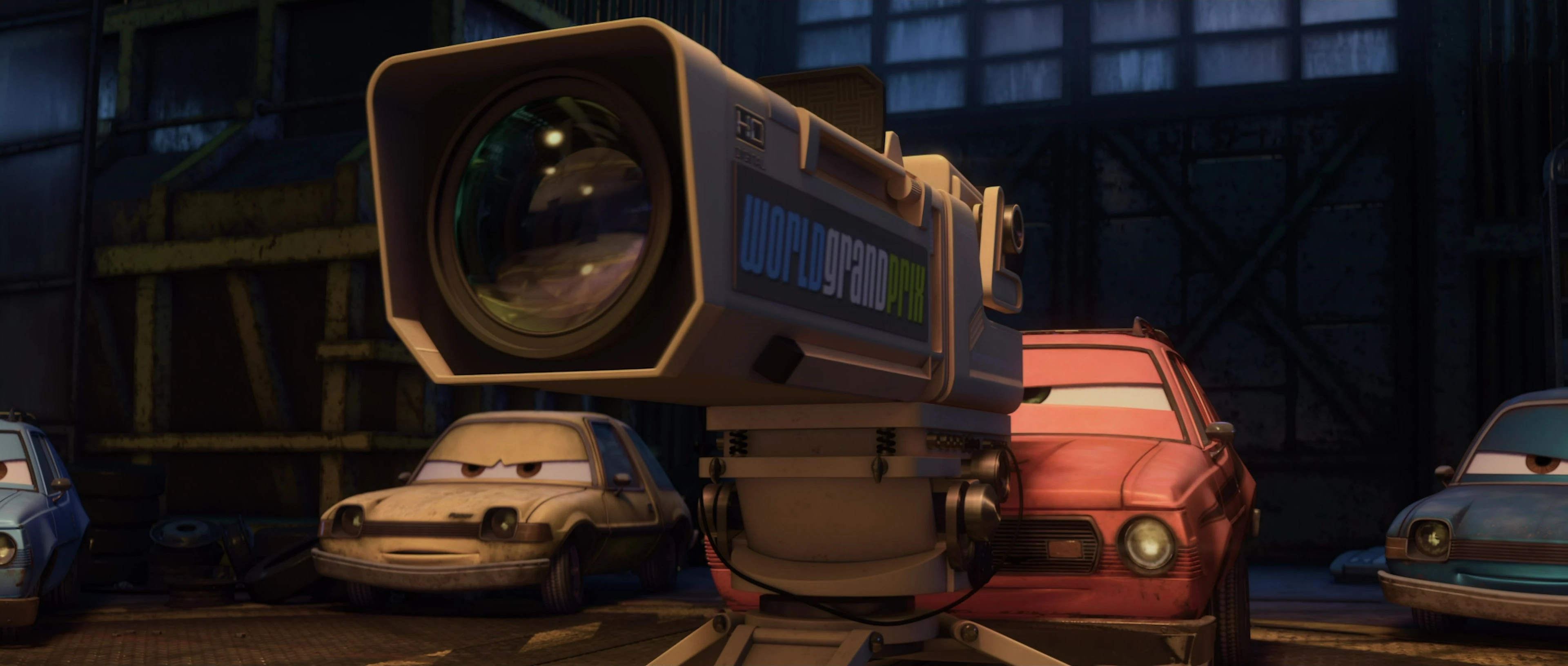 During the first race of the World Grand Prix in Tokyo, Grem and Acer aim the camera at Miguel Camino, exploding his engine in the process, before spotting Mater in Lightning McQueen's pit box. The camera was later used to explode the engines of Rip Clutchgoneski and Max Schnell.