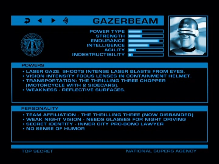 Simon J. Paladino, also known as Gazerbeam, was a Super from The Incredibles whose powers allowed him to generate laser blasts from his eyes, assuming that he concentrated on his target; the helmet he wore allowed him to further control and intensify his blasts. The Operation Kronos Database assigned him a threat rating of 6.3.