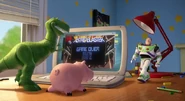 After the toys return home, Hamm attempts to beat a Buzz Lightyear: Attack on Zurg video game that was previously played by Rex and asks him for a hand. However, Rex, too overjoyed about his triumph over defeating Zurg in an elevator, doesn't help, and Hamm loses the game before he can continue with his playthrough and gets upset. He then sees a sobbing Al on TV about how he lost his fortune, which makes Hamm comment that crime doesn't pay.