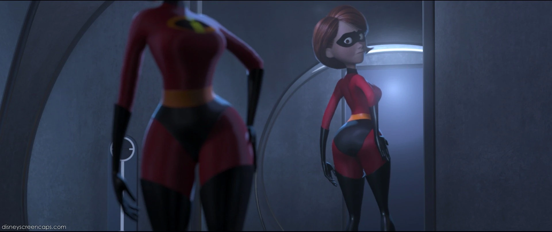 Elastigirl leaves the cave to save Bob. She uses her quick thinking skills and her incredible elasticity to make her way to the containment unit where her husband is being held captive. She can't help but notice in a hallway mirror she notices that the way the new tight super-suit made her expose a full display of her figure from the waist down. On the way, she runs into Syndrome's security guards, but defeats several of them at once while her body is caught between two sets of sliding automatic doors by kicking one, using her abdomen unintentionally as a tripline for two others, and punching two more to knock them out and obtain their key to the doors to free herself.