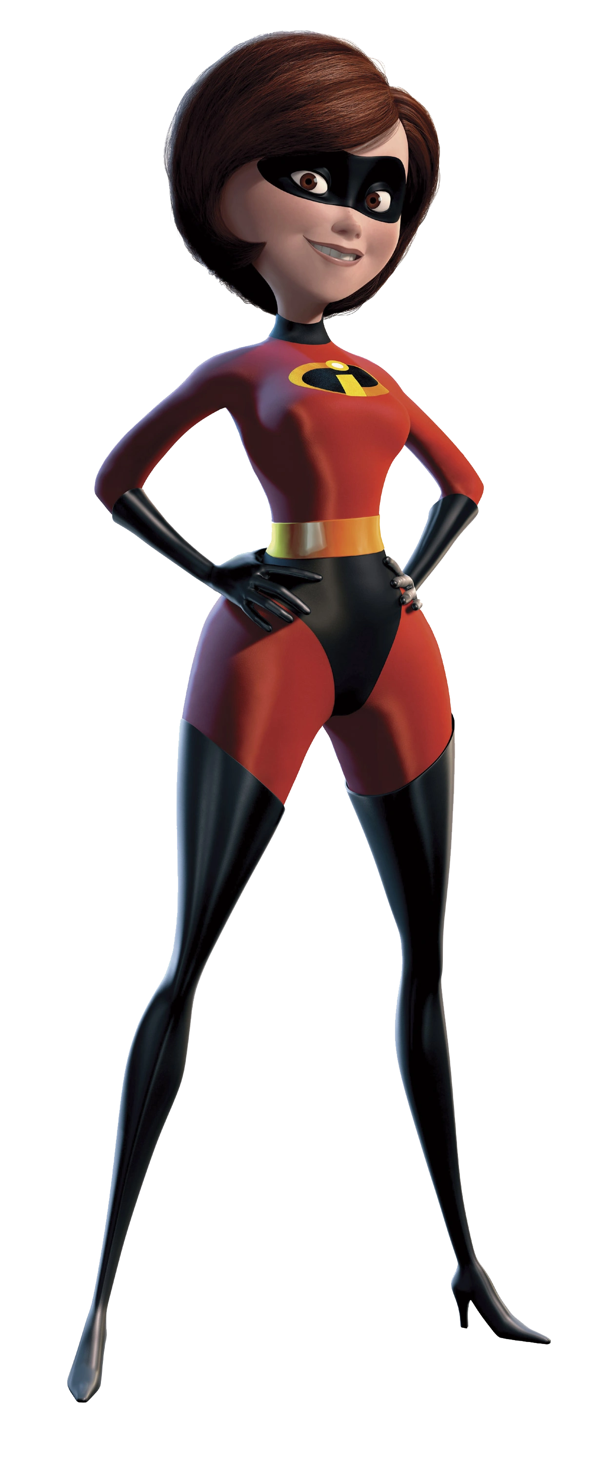 In her glory days as Elastigirl, she had long red hair worn in a flip and had a slim, athletic figure, with the exception of rather wide hips. She wore a light gray leotard with a black and white "EG" insignia on the chest, with a scarlet eye mask, headband, and belt, scarlet over-the-elbow gloves, and thigh-high scarlet boots.