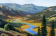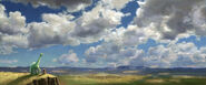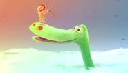 The next morning, Arlo wakes up to find Spot only to be encountered by a fanatical band of pterodactyls consisting of a Nyctosaurus named Thunderclap and his accomplices Downpour and Coldfront. The pterodactyls turn out to be savagely carnivorous. After they find Spot, Arlo and Spot run away, encountering a pair of Tyrannosaurus named Nash and Ramsey who both ward the pterodactyls off. Arlo and Spot then meet Nash and Ramsey's father Butch, who agrees to let the two of them join their party if they can help them locate a herd of longhorns they had lost. Spot manages to sniff them out with Arlo discovering the presence of "Rustlers." On Butch's instruction, Arlo lures the Rustlers out, who are revealed to be a group of Velociraptors led by Bubbha looking to steal Butch's herd. Butch and his children try to fend off the Rustlers, and Arlo successfully hits two of them allowing Butch to scare them off for good. With the T-rexes now fully respecting Arlo, Butch helps lead them towards the area of their homeland. Along the way, Arlo and Spot encounter a human off in the distance, but ignore him and continue on.
