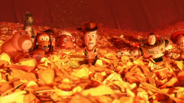 This is where garbage, cascading down an enormous bowl, is burned to ashes by an incinerator at the very center of the bowl. Woody, Buzz and the other toys end up here as a result of Lotso's betrayal and face certain, inevitable death until they are rescued by the Aliens operating a giant claw.