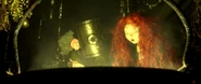 The witch lives the life of a wood carver, and uses her knowledge in magic to help her in her work. the Will O’ the Wisps lead Merida to the hut of the witch who insists in presenting herself as a simple wood carver. But Merida rapidly realizes her real nature, after seeing a broom moving by itself, a speaking crow, and other abnormal wonders. In exchange of buying her entire wood carving stock with her necklace, Merida convinces the witch to give her a spell in the form of a cake, to change her mother and thus change her fate. While brewing the spell, the witch remarked that long ago, a prince desired a similar spell to change his fate and grant him the strength of ten men.